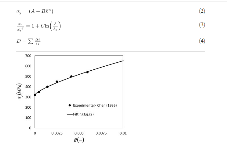 Chen (1995) 獲得的實驗數(shù)據(jù)用于獲得 JC 模型的材料常數(shù)。還值得一提的是 MACOR是有康寧公司生產(chǎn)的可加工陶瓷,,在文獻中沒有發(fā)現(xiàn)其他最近的實驗測試來考慮非彈性應(yīng)變和應(yīng)變率對 Macor 屈服應(yīng)力的影響。當前模型中沒有考慮溫度效應(yīng),因為 Macor 材料在小應(yīng)變下往往會失效。由于低塑性變形,這不會引起大量熱量。由于切削刀具和 Macor 工件之間的摩擦,主要的熱源將在高切削速度下產(chǎn)生。材料常數(shù)按以下順序獲得。首先,使用方程在 280 s-1 的應(yīng)變速率下獲得 Macor 的常數(shù) A、B 和 n。 (2).實驗數(shù)據(jù)和擬合曲線如圖 2 所示。接下來,使用實驗獲得的不同應(yīng)變率的極限應(yīng)力 (σu) 包括應(yīng)變率對屈服應(yīng)力的影響。極限應(yīng)力和參考極限應(yīng)力之間的比率針對應(yīng)變率和參考應(yīng)變率之間的比率繪制。